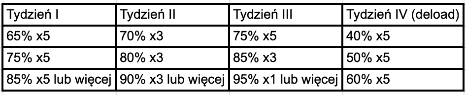 Trenujesz 3-4 razy w tygodniu; każdy trening bazuje na innym ćwiczeniu. Jest to kolejno: przysiad, wyciskanie leżąc, martwy ciąg, wyciskanie nad głowę. Każdy cykl treningowy trwa 4 tygodnie, w pierwszym wykonujemy 3 serie po 5 powtórzeń bazowego ćwiczenia, w drugim 3×3, w trzecim 1 serie na 5 powtórzeń, 1 serię na 3 powtórzenia i 1 serię na 1 powtórzenie. Czwarty tydzień to deload, w którym wykonujesz 3 serie po 5 powtórzeń- nie omijaj go! Każda seria w danym tygodniu ma sztywno przypisany ciężar z którym pracujesz.
